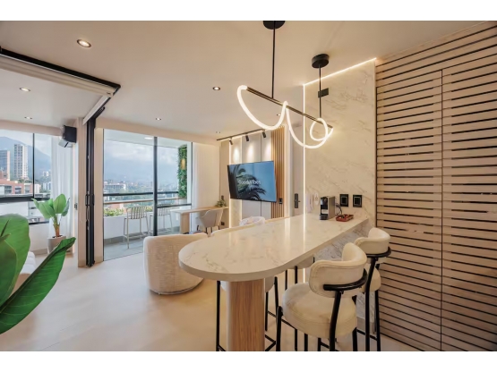 Apartamento para rentas cortas de 2 alcobas con vista espectacular a la ciudad. Cocina abierta dotada, sala, balcón, 1 alcoba con baño y vestier, espacio de seginda alcoba que se cierra, baño social, zona de ropas dotada. Parqueadero. Zonas comunes: La unidad cuenta con zona verde, Ascensor, Gimnasio, Baño Turco, Parqueadero de Visitantes, Jacuzzi, Juegos infantiles. Ubicado en la vía linares cerca al cc El Tesoro, Santa Fé, Complex de los Balsos y Oviedo.