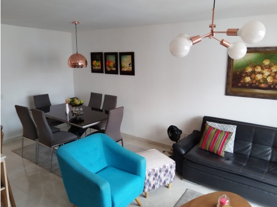 Pesos ColombianosSe vende apartamento de 80 m2 con sala comedor, balcón, tres habitaciones y dos baños, e incluye cortinas, calentador, esquineros, horno, divisiones de baño, repisas en las habitaciones y se entrega completamente pintado. El conjunto residencial está estratégicamente ubicado cerca de la avenida Mirolindo y a solo 5 minutos del supermercado Mercacentro, y ofrece zonas comunes como cancha sintética, cancha múltiple, senderos peatonales, áreas de juegos infantiles y próximamente piscinas.