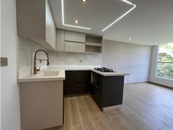 hermoso apartamento en sabaneta para estrenar con vista a bosque área 55 mt2, cocina abierta con isla, salon comedor, dos alcobas, estudio,dos closet. unidad con piscina, porteria 24 horas, juegos infantiles